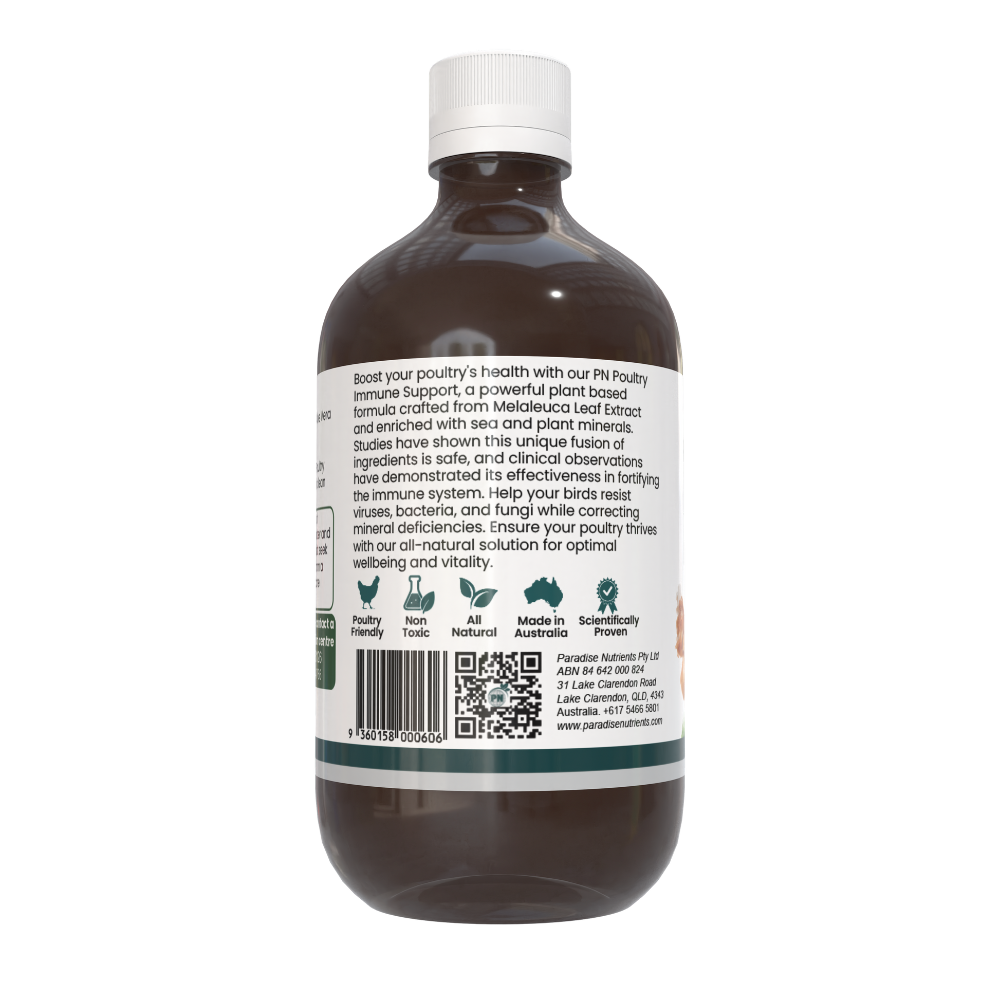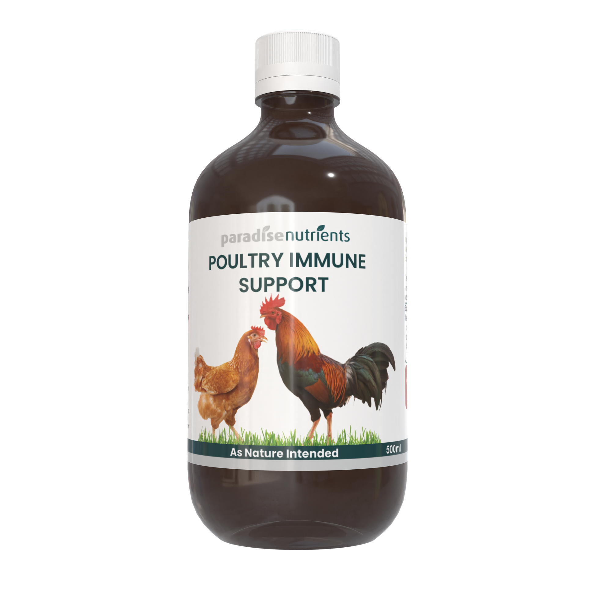 Paradise Nutrients Poultry Immune Support has been designed to be a simple application. By adding a few drops into your chicken’s water gives your chickens a natural extract, immune support. The concept is to assist the immune system so it can recognise and kill off pathogens at an early stage, letting the bird build up a stealthy immune system.