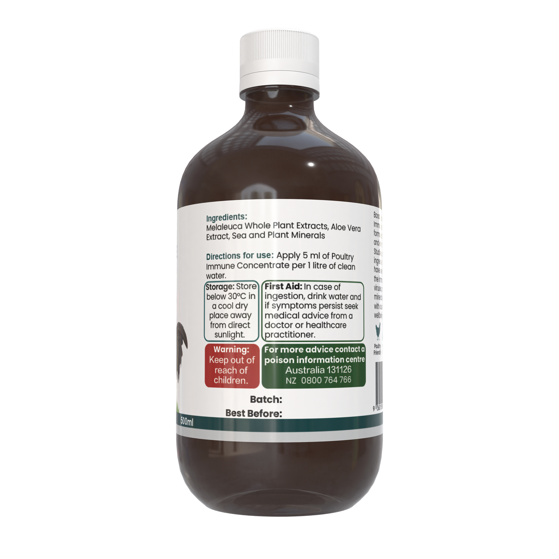 Apply 5 ml of Poultry Immune Concentrate to 1 litre of clean water.
